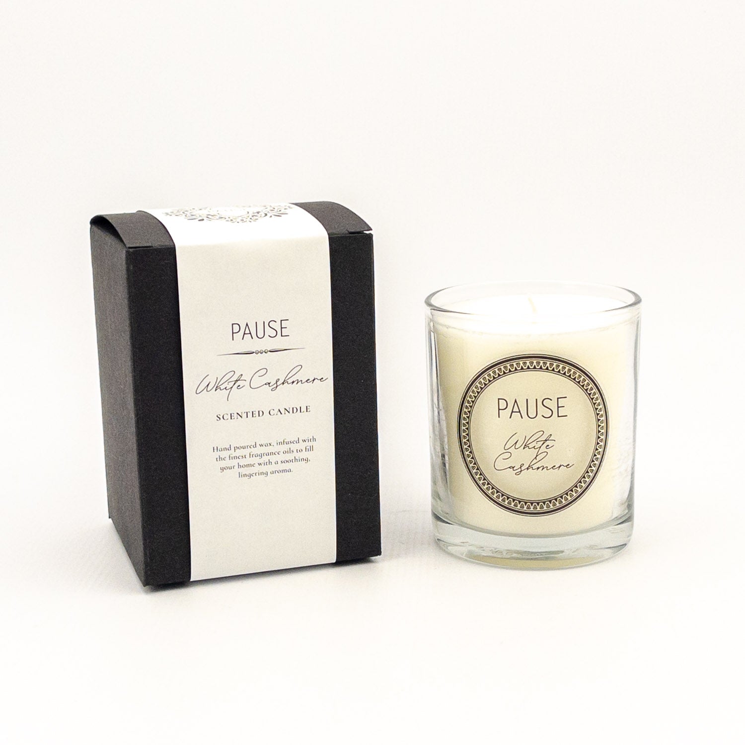 Unwind with our PAUSE Glass Candle in medium. Choose from five different scents including WHITE CASHMERE, VANILLA, CITRUS GLOW, AZURE, and AFTER THE RAIN, all designed to help you take a moment and relax. Perfect for a cozy night in or a self-care day.