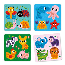 There are four fun backgrounds – bugs, farm animals, sea creatures and jungle animals. Use the 6 colours of modeling play dough to roll small circles of different sizes to match the circles on the scenes and complete the pictures.