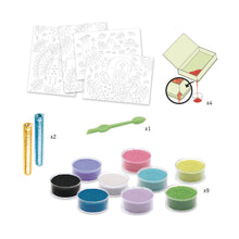 This glitter and sand art kit contains 4 illustrated cards, 9 pots of coloured, ready to apply sand and 2 tubes of gold and blue glitter. It’s easy to use, like a sand version of paint by numbers: peel off the paper on each numbered section using the special tool included to reveal the sticky surface. Sprinkle the sand and glitter separately onto the area following the colour number key and shake the excess sand and glitter off.