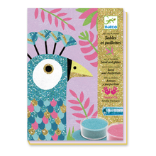 Dazzling Birds Glitter & Sand Art by Djeco. This amazingly sparkly sand and glitter art kit allows your little one to decorate a few attractive pictures of some truly dazzling birds.