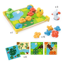 - Contents: 1 perforated wooden board, 8 illustrated perforated sheets, 8 "observation" cards, 15 flower pegs and 3 large 3D animal pegs(1 mouse, 1 duck and 1 frog).