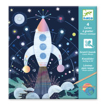 Cosmic Mission Scratch Cards by Djeco. Reveal four exciting space scenes with this absorbing scratch art set.